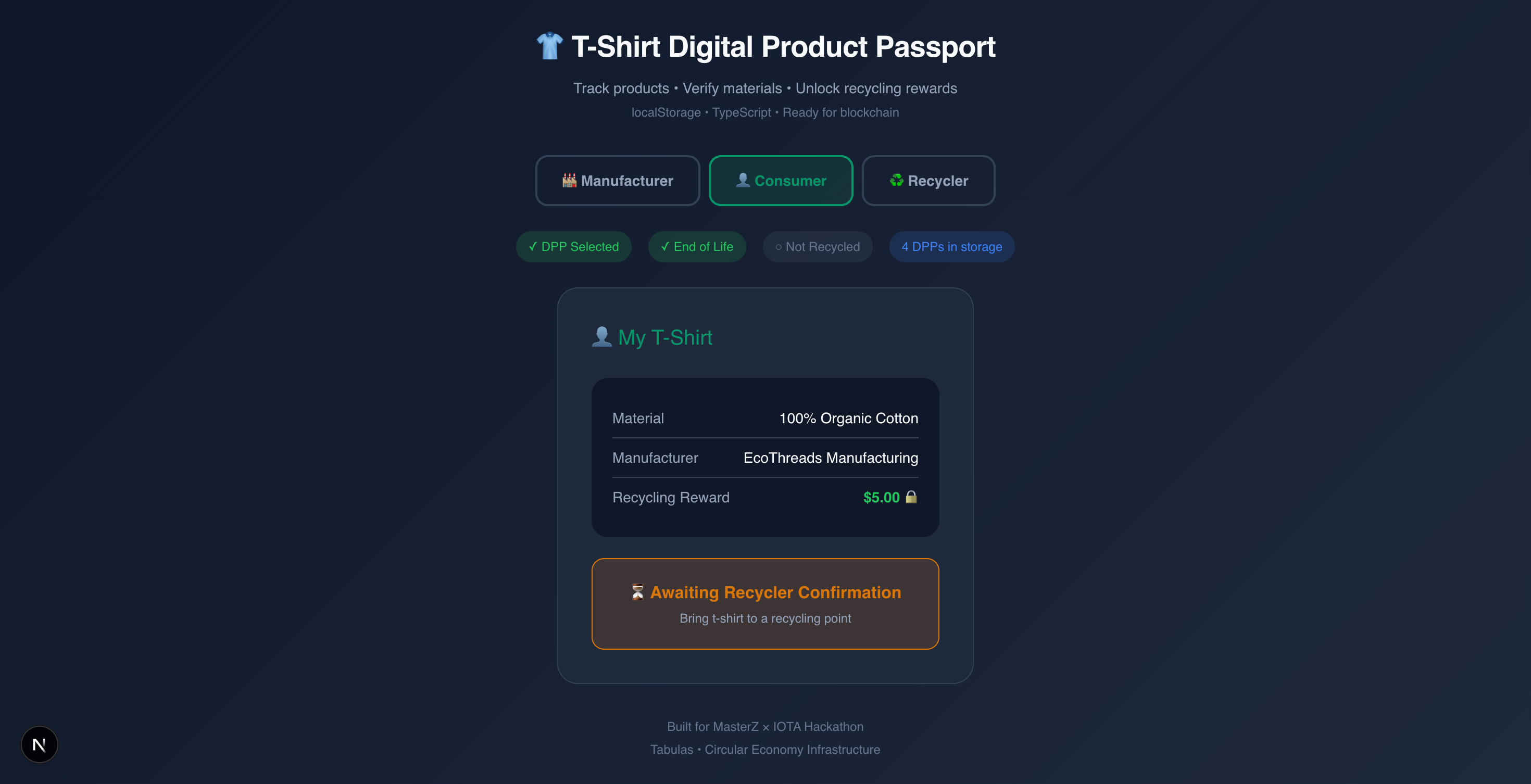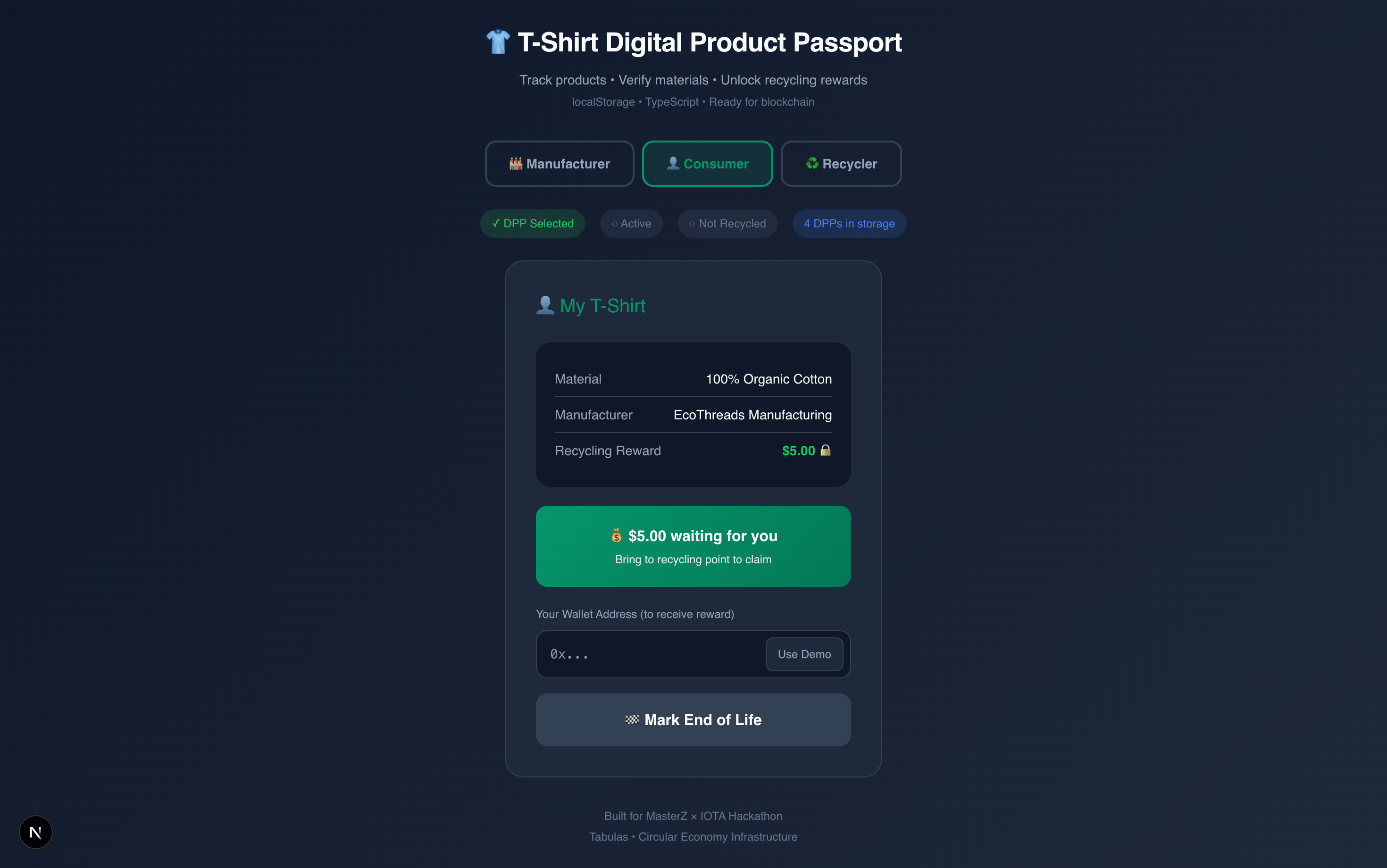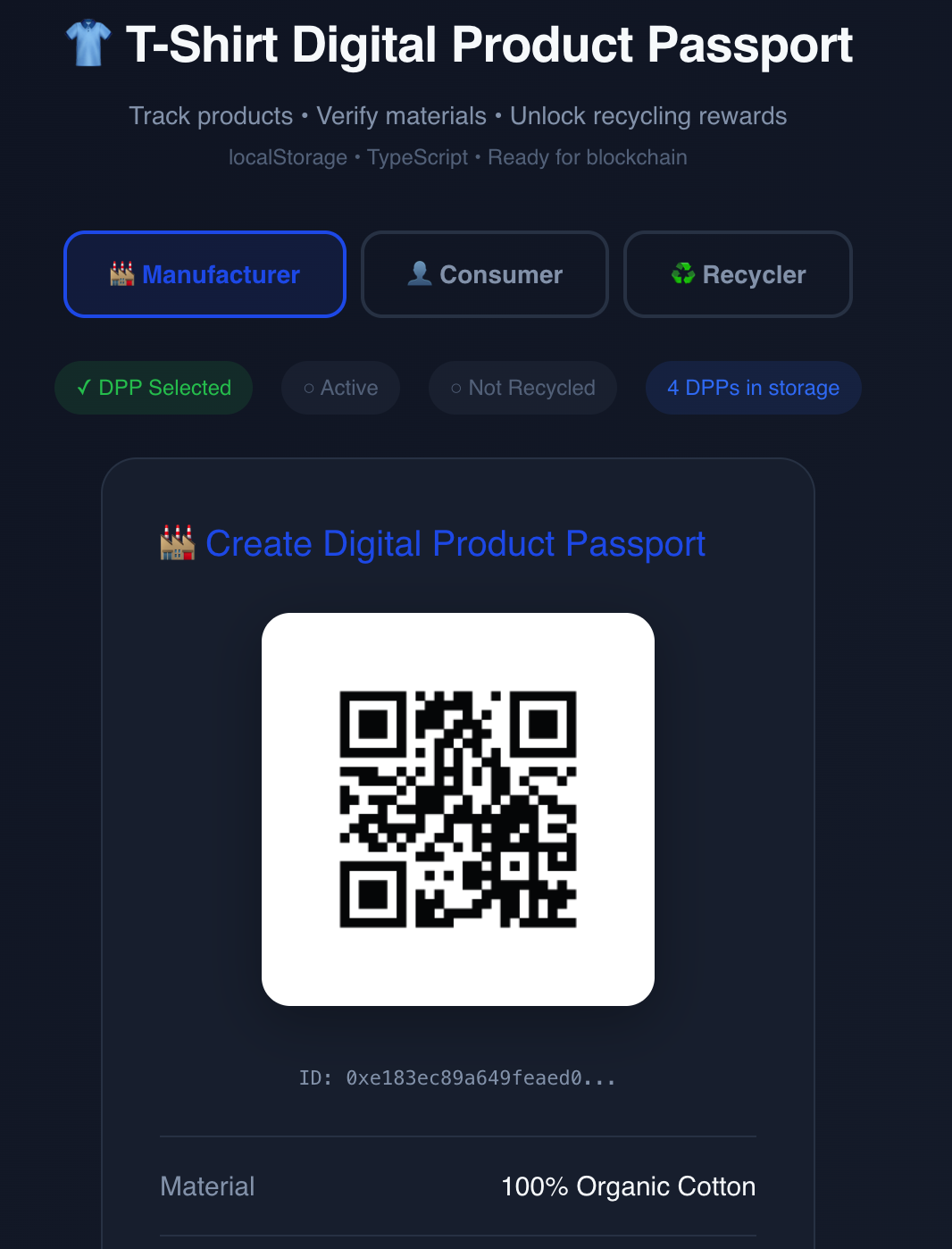 Every garment gets a verifiable digital identity that persists from factory to consumer to recycler. Consumers see the full story and get rewarded for returning products. Brands maintain visibility throughout the lifecycle. Recyclers verify materials with proper context. All EU-compliant, all interoperable, all actionable.