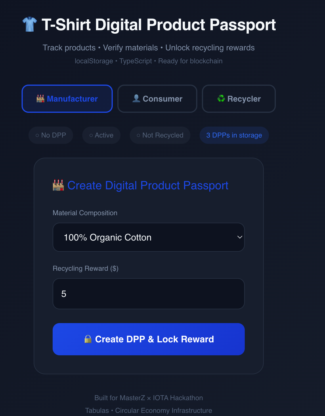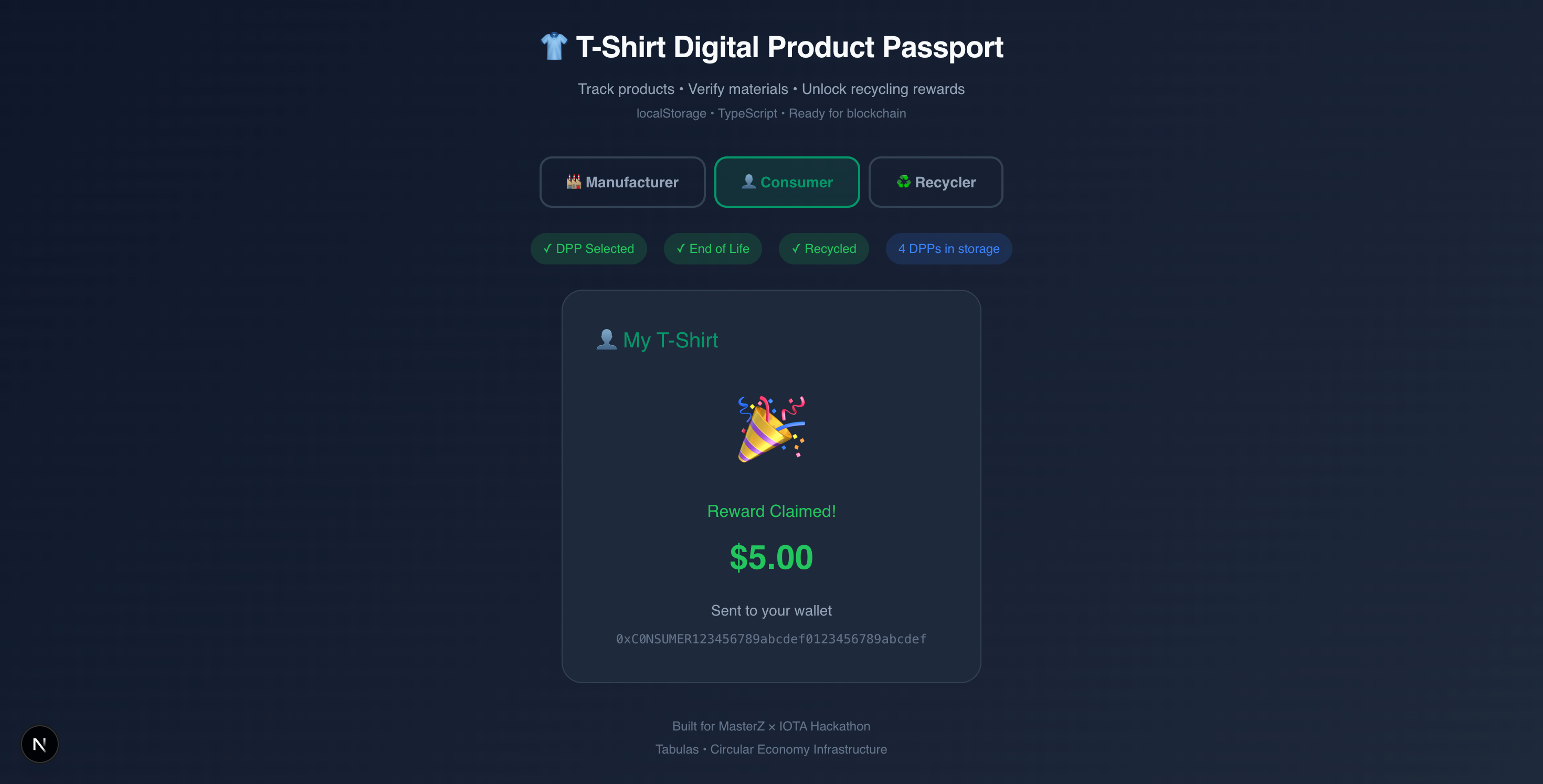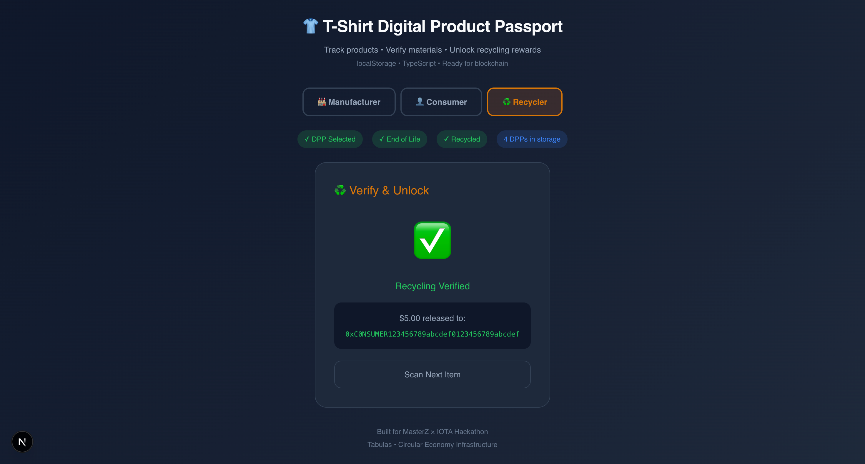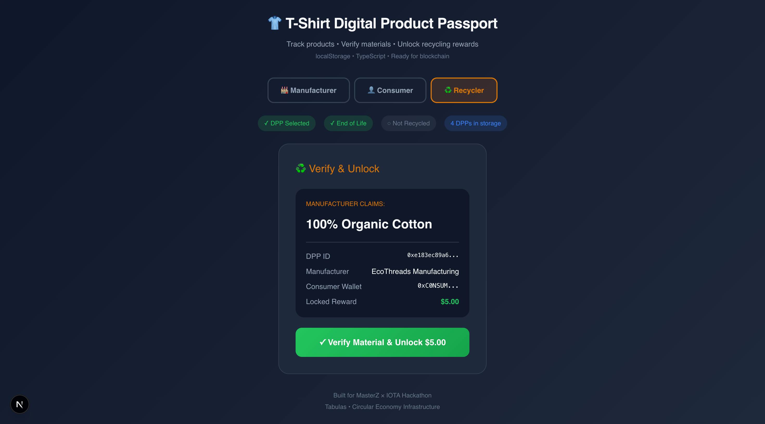 Every garment gets a verifiable digital identity that persists from factory to consumer to recycler. Consumers see the full story and get rewarded for returning products. Brands maintain visibility throughout the lifecycle. Recyclers verify materials with proper context. All EU-compliant, all interoperable, all actionable.